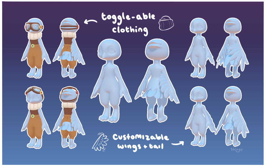 Chirrup is a cute and customizable bird base avatar with physbones, in-game toggles, and lots of features! Chirrup also comes with a simple and cute aviator outfit with mismatch buttons inspired partly by a bird's love for collecting